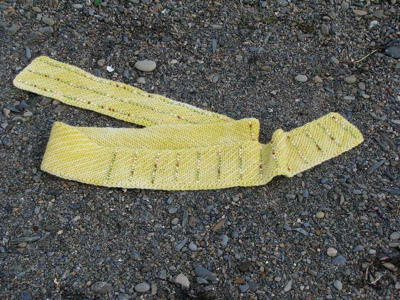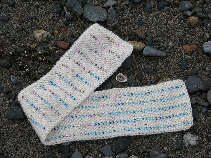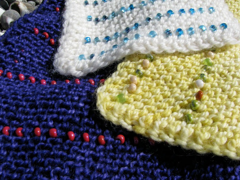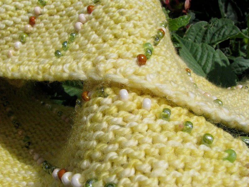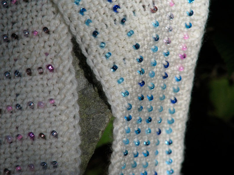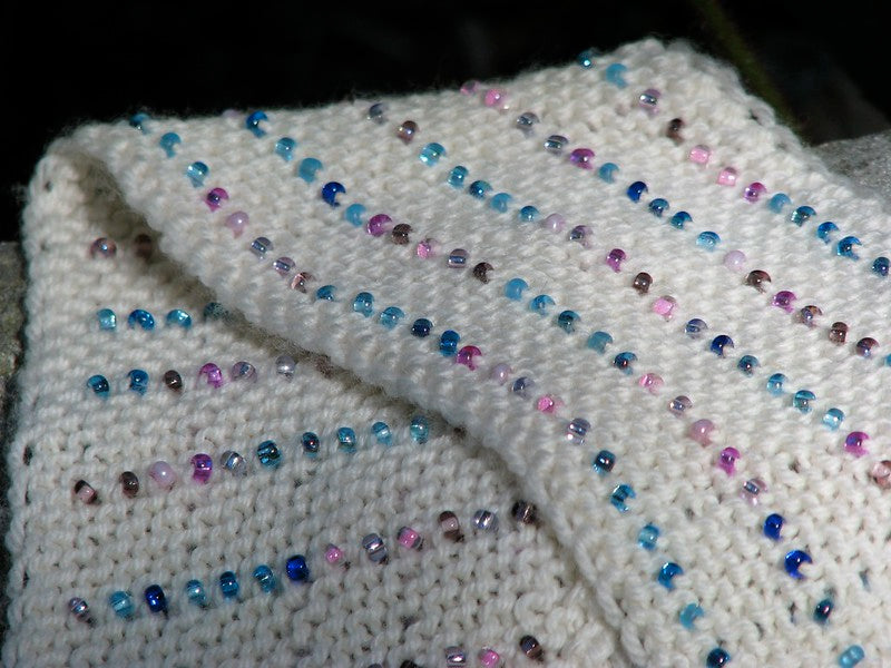Techniques utilisées : perles entre les mailles, jetés en début de rang, joints de fils épissés