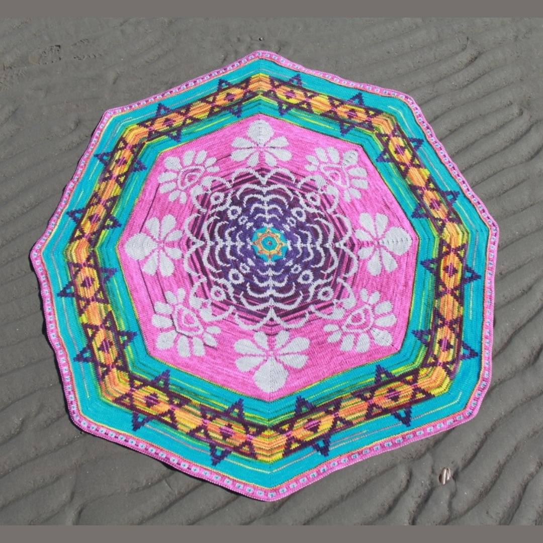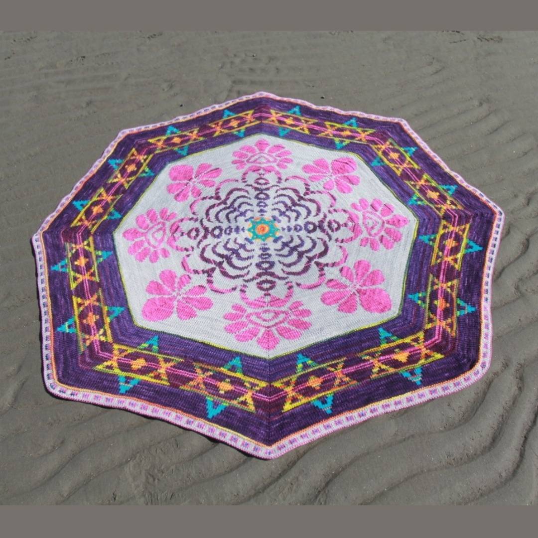 Une couverture super chaude et douillette (56 po de diamètre) inspirée de grandes fleurs abondantes et audacieuses. Une variété supplémentaire de design est créée grâce à l'utilisation de quatre répétitions dans le corps principal de la couverture. L'utilisation d'une approche flexible pour le début/la fin de la position du tour élimine les ondulations dans le motif principal.