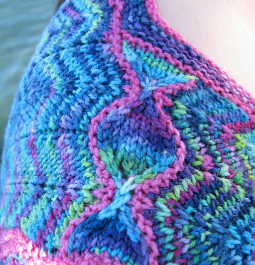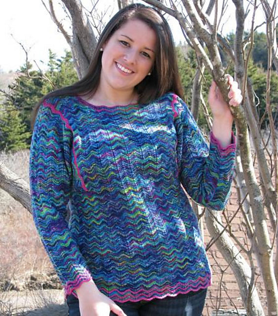 Techniques utilisées : Tricot à chevrons avec augmentations et diminutions, selles d'épaule complexes, soufflets latéraux.