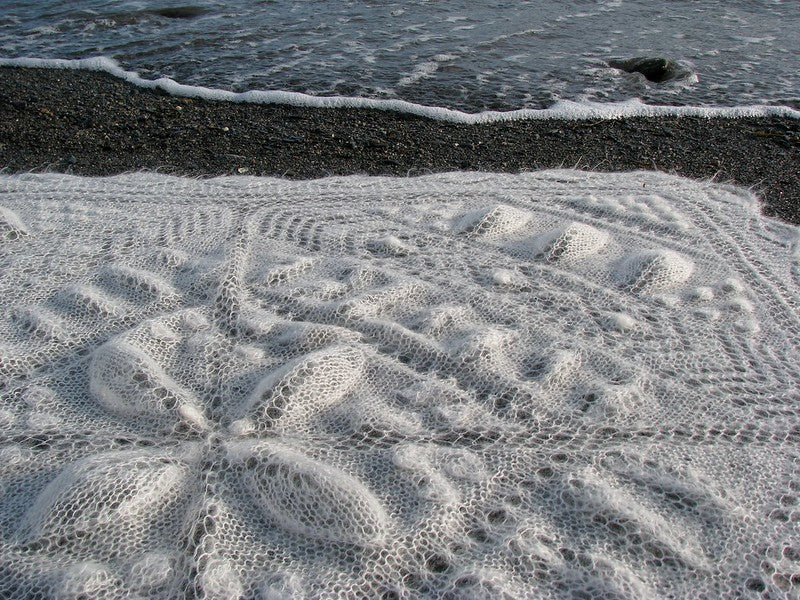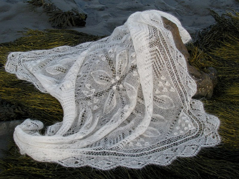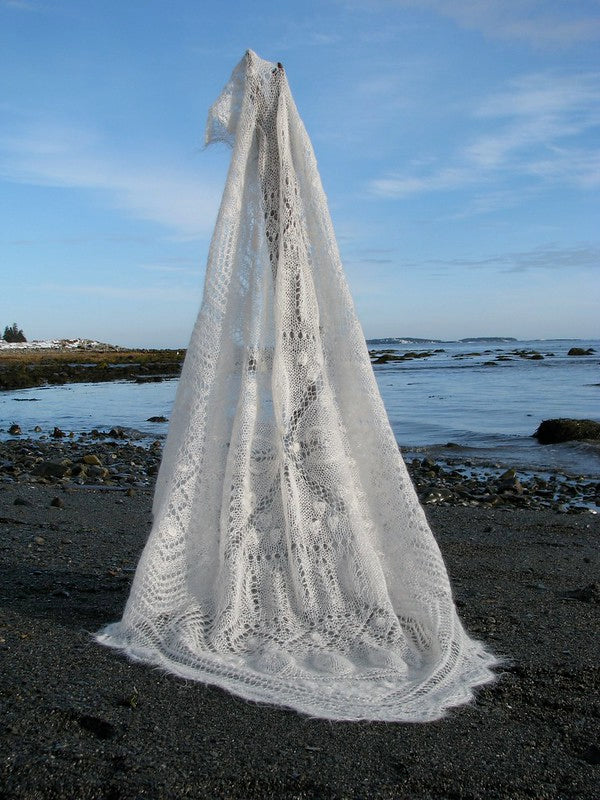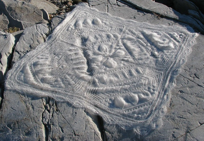 Inspiré des carrés de courtepointe traditionnels, ce châle est impressionnant et doux comme un nuage. Plus facile à tricoter qu'il n'y paraît. Il est réalisé avec des aiguilles de 6 mm / US 10. Ce châle a été exposé au Musée des textiles de Toronto.