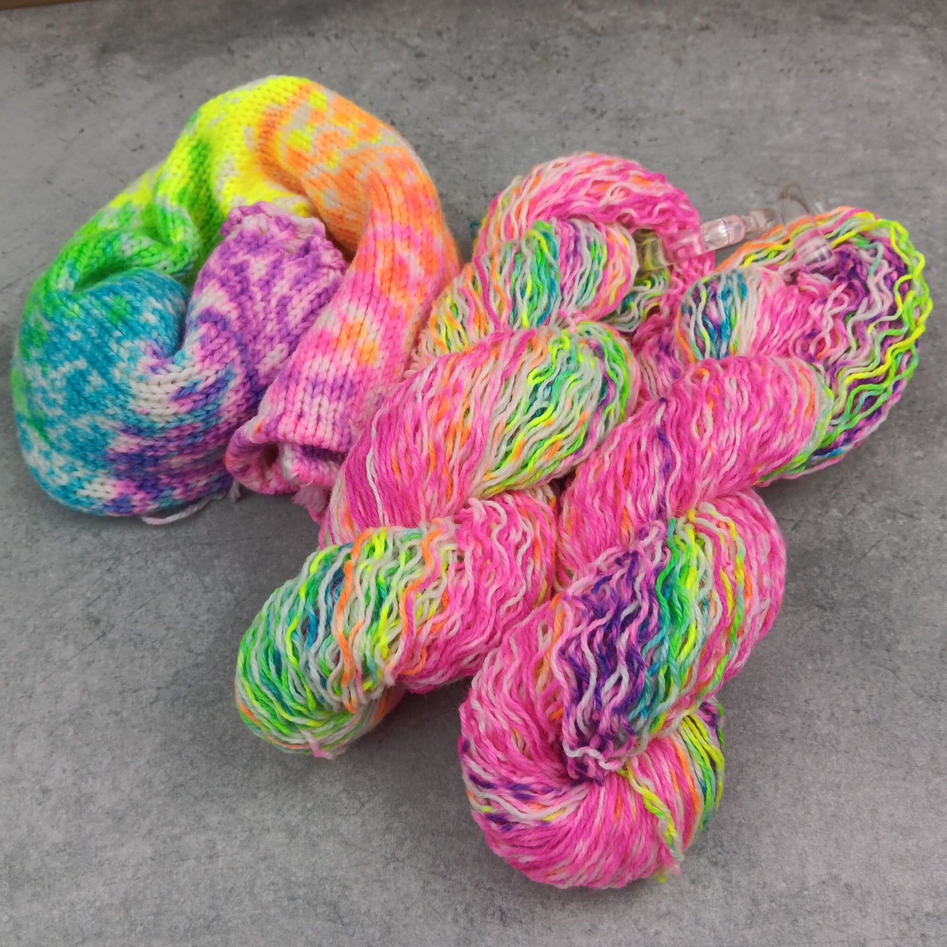 This is a set of 2x 55 gram skeins. The yarn has been dyed as a blank and unravelled after dyeing. Due to being dyed in a blank, the yarn is a bit wavy.